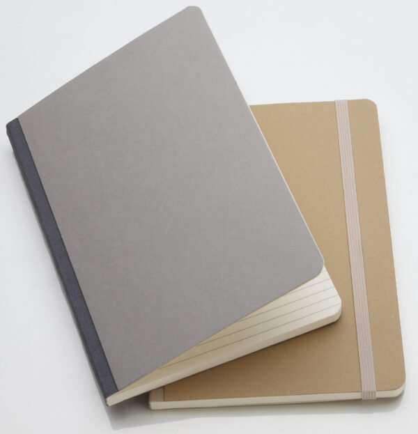 - Cover: Eco cardboard in earthy tones combined with a flexible, durable canvas spine. The cardboard is GMO-free and sustainably certified, available in green and multiple natural shades inspired by organic residues and cotton.